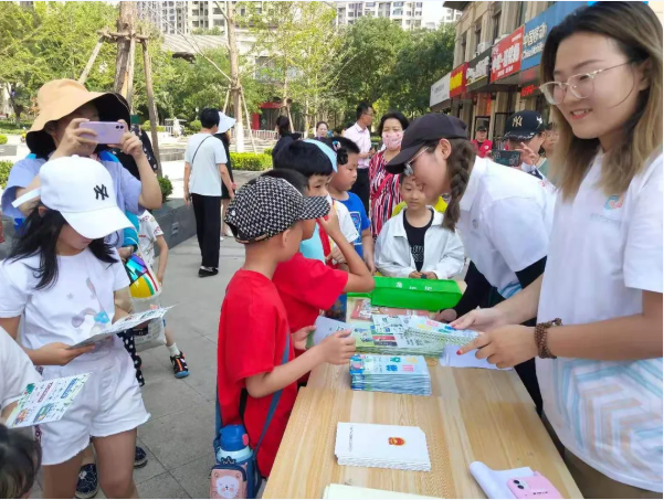 在活动现场,实践团成员与社区工作人员一起对居民进行了垃圾分类宣传教育,发放垃圾分类宣传材料,并现场讲解垃圾分类相关知识,家长与孩子们共同学习讨论,气氛十分热烈。